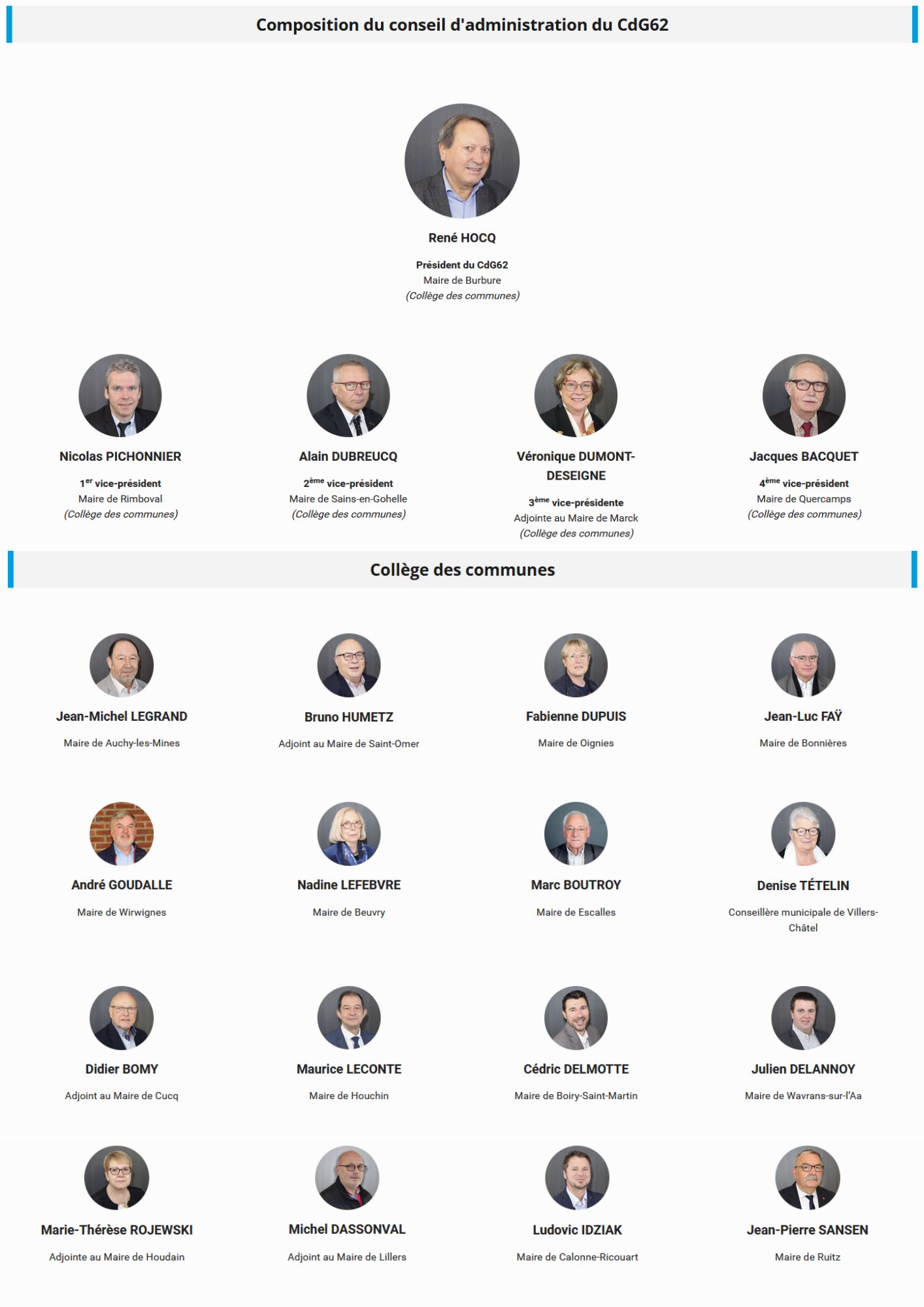 Administrateur du CdG62 depuis 2014, Monsieur HOCQ en occupait jusqu’à présent la fonction de 2ème Vice-Président. Élu engagé de longue date dans la vie locale, il est également Vice-Président du Conseil Départemental du Pas-de-Calais et Vice-Président de l’Association des Maires du Pas-de-Calais (AMF62).