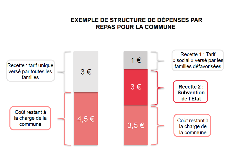 – La grille tarifaire de restauration scolaire doit prévoir au moins 3 tranches, calculées selon les revenus des familles ou idéalement le quotient familial. Au moins une tranche doit être inférieure ou égale à 1€ et une supérieur à 1€ ;