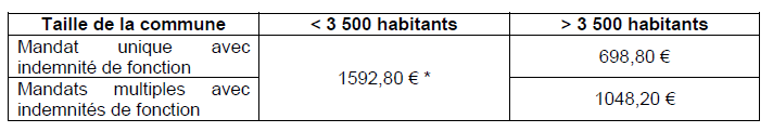Pour les élus de communes de plus de 3 500 habitants , il est de 698.80 € en cas de mandat unique et de 1 048.20 € en cas de mandats multiples.