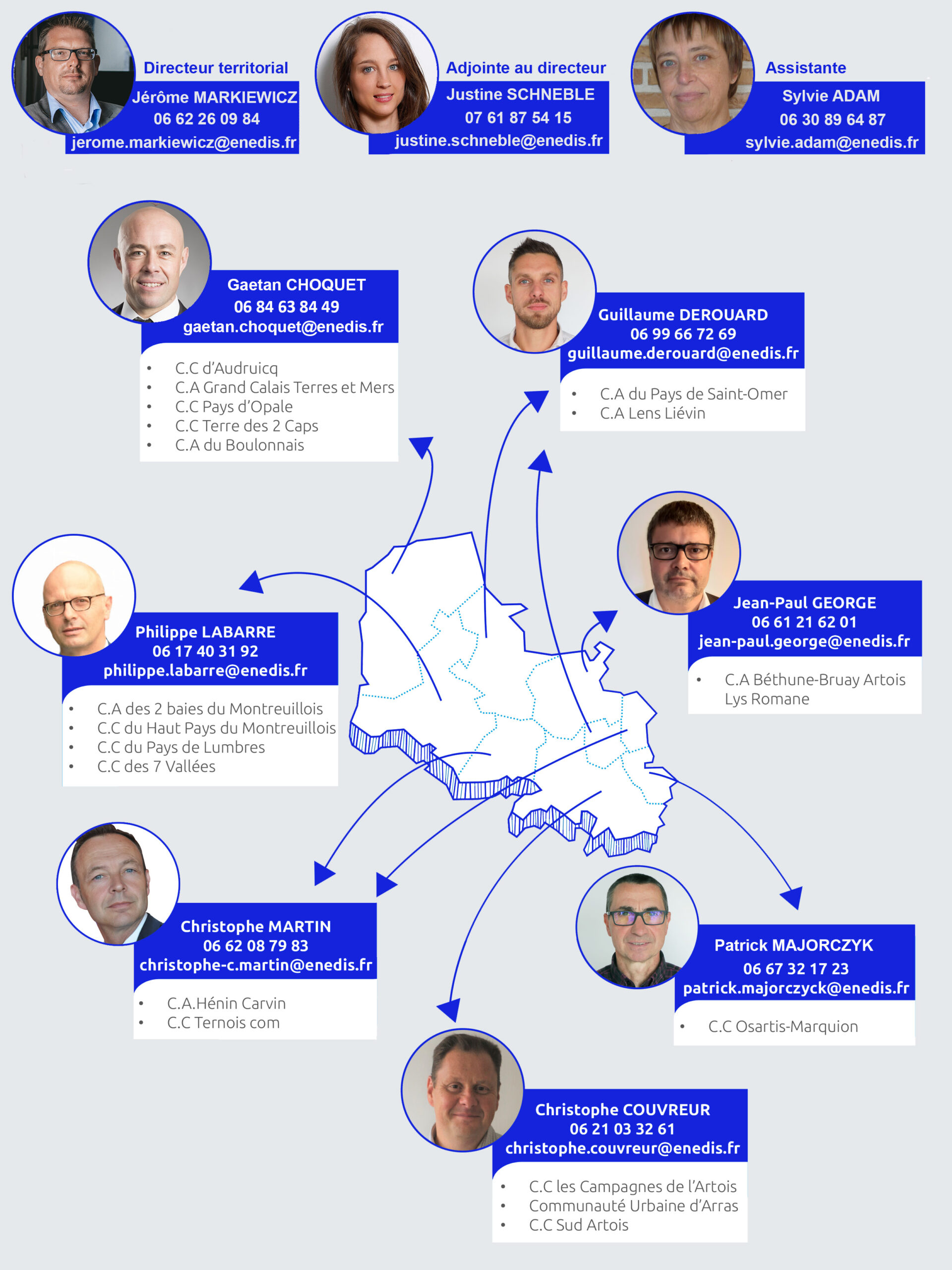 Toute l’équipe de la direction territoriale du Pas-de-Calais se mobilise à vos côtés. Pour ces sujets mais également pour tous les autres en lien avec le réseau électrique, votre manageur territorial se tient à votre disposition. Vous trouverez ci-dessous les coordonnées respectives de vos interlocuteurs de proximité.