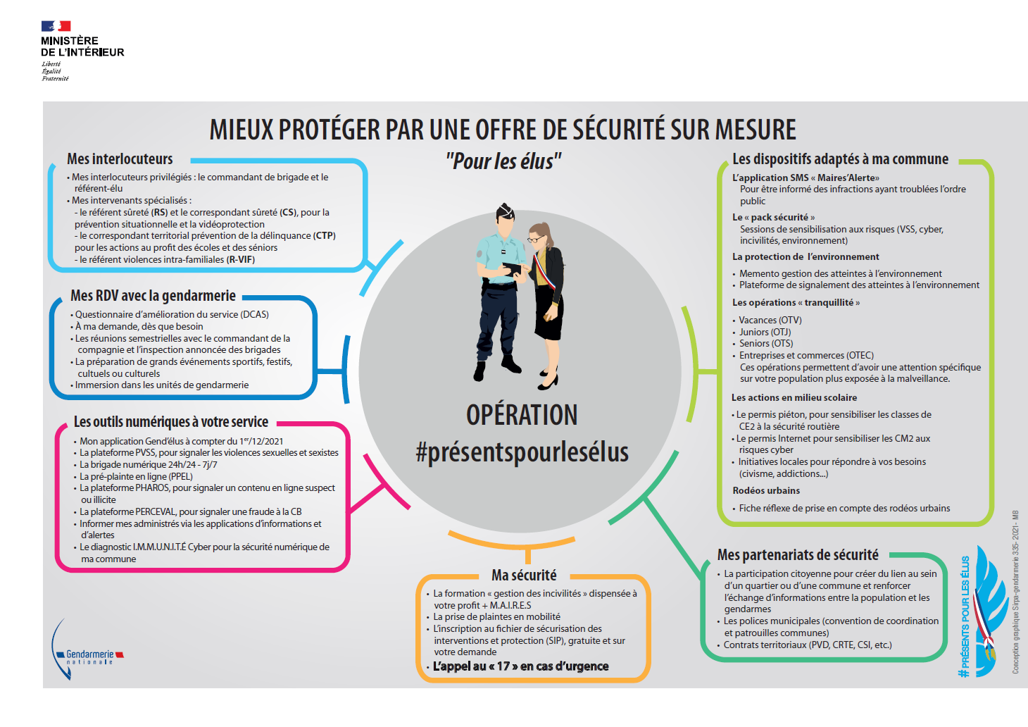 – La présentation des dispositifs de la Gendarmerie et ministériels pour les élus et la population : plateforme de signalement des violences sexuelles et sexistes, Perceval, participation citoyenne, opération tranquillité vacances, cybersécurité, gestion des incivilités, …