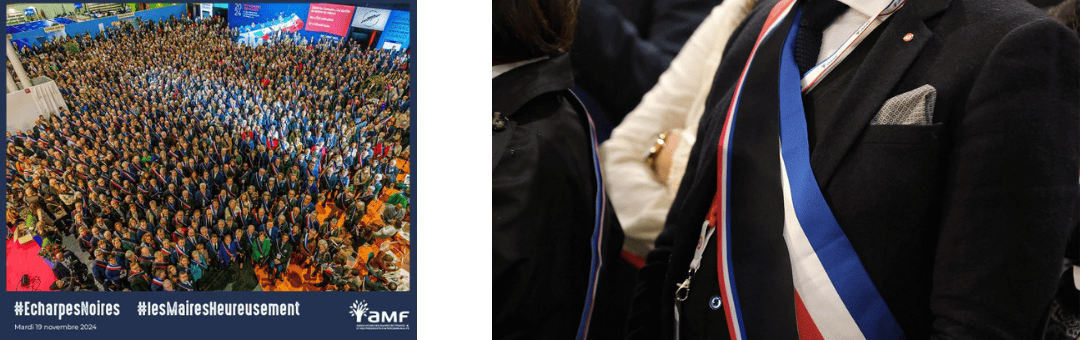 Près de cinq mille maires venus de toute la France se sont rassemblés en marge du 106ème Congrès des Maires de France en arborant une écharpe noire au-dessus de leur écharpe tricolore afin de protester contre le Projet de loi de Finance.