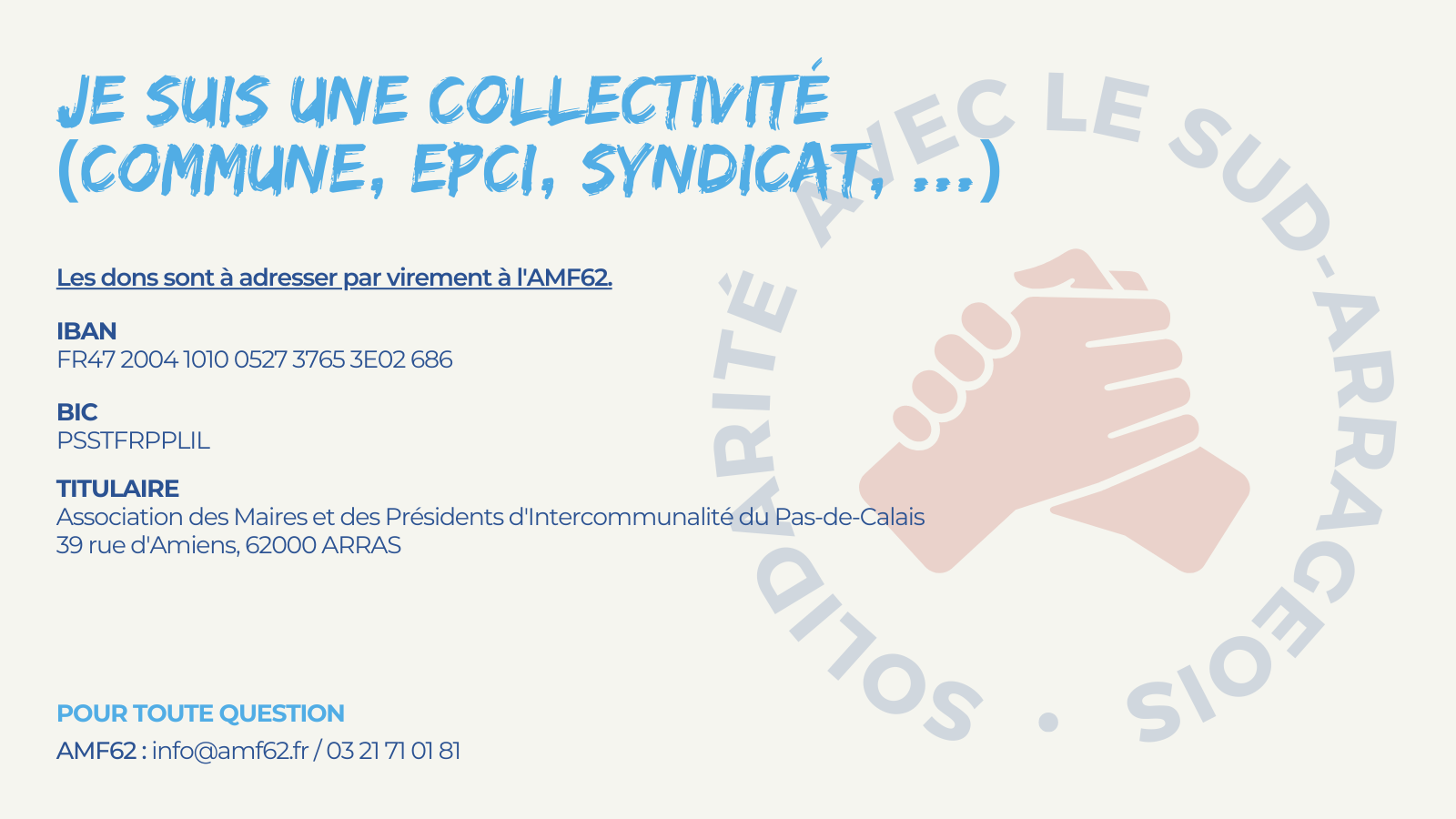 L’AMF62 vous invite à partager cet appel à la solidarité auprès de vos habitants et des entreprises de votre territoire. A cet effet, une affiche reprenant toutes les informations à connaitre pour faire un don est disponible en téléchargement ICI. N’hésitez pas à la relayer !
