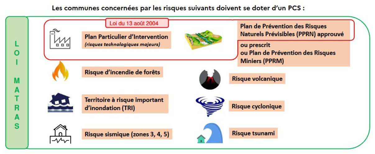 La loi MATRAS du 25 novembre 2021 conforte de dispositif des plans communaux et intercommunaux de sauvegarde. Ainsi, il devient obligatoire pour les communes soumises à des risques pré-identifiés de se doter d’un PCS. Ces communes sont alors notifiées par le Préfet du département. Le manquement de constitution d’un PCS constitue d’ailleurs une faute grave pouvant entraîner ma responsabilité pénale du maire.